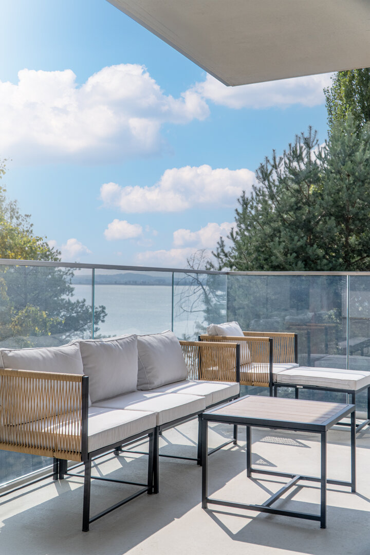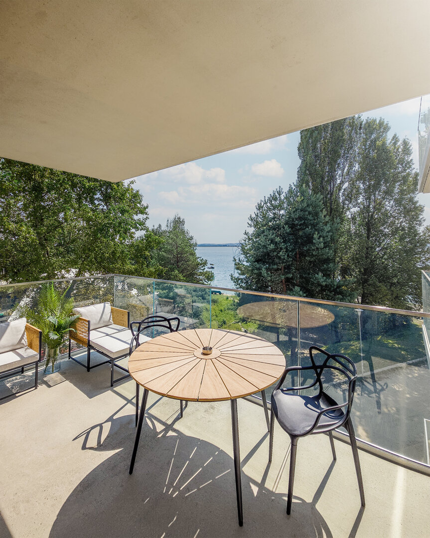 Apartamenty Nowoczesne, elegancko urządzone, składające się z: Aneks kuchenny – w pełni wyposażony (lodówka, płyta, naczynia). Sypialnia + salon z rozkładaną sofą – idealne dla 2–4 osób. Taras / balkon z widokiem na jezioro. Klimatyzacja, b